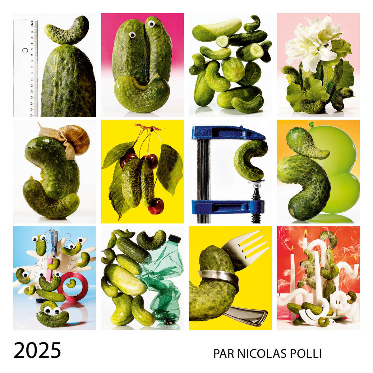 Dieser Kalender bietet liebenswerte und unkonventionelle Illustrationen im Comic- oder «Gemälde»-Format mit lustigen Texten. Mit farbenfrohen und ausdrucksstarken Zeichnungen erweckt der Designer das Cornichon zum Leben und macht es zum Protagonisten einer Vielzahl satirischer Alltagssituationen.